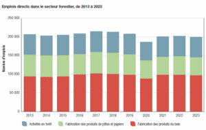 Tout au long de l’histoire du Canada, le secteur des produits forestiers a été l’une des sources d’emploi les plus importantes. Le secteur forestier employait environ 199 345 personnes dans tout le pays en 2023, dont environ 11 000 employés autochtones (2021), dans 300 collectivités d’un océan à l’autre qui dépendent de ce secteur pour l’emploi et le revenu. Un grand nombre de ces collectivités, souvent éloignées des zones urbaines, n’auraient que peu ou pas de solutions de rechange au secteur forestier.